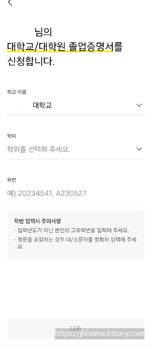 졸업증명서 검색 후 학교이름, 학위, 학번을 적습니다.