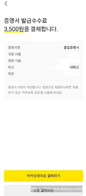 전 간편해서 자주 사용하는 편인대요~ 수수료는 학교 홈페이지에서 다운받는것과 같은 3500원이라서 저는 급하게 필요한일 있을떄는 카카오톡 지갑 전자증명서로 발급 받습니다! 아주 편리한 세상입니다!!