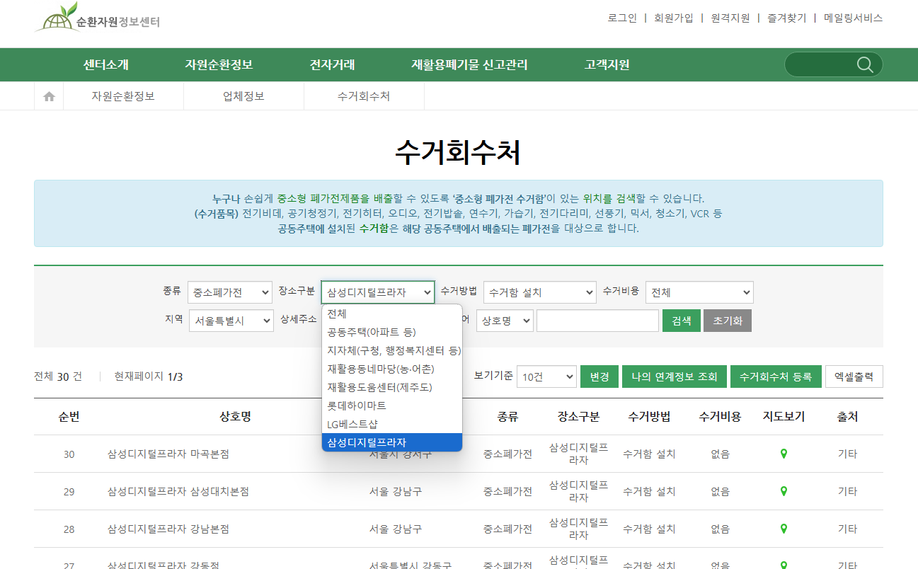 순환자원 정보센터에서 종류, 장소, 수거방법등 검색을 하면 수거회수처 정보를 알 수 있습니다. 장소를 보시면 공공주택, 지자체 등 다양하게 있습니다~ 롯데하이마트나 LG 베스트샵, 삼성디지털 프라자등 매장에서도 수거를 할 수 있다고 해서 놀랐습니다.