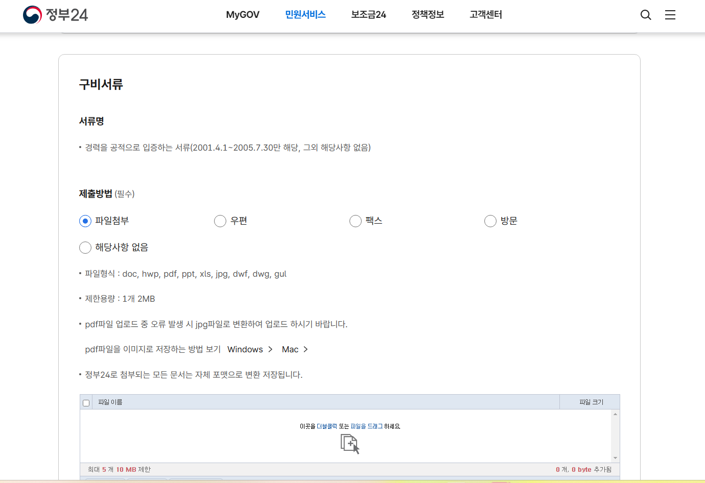 저는 저 구비서류가 필요치 않아서 제출방법에 보시면 "해당사항없음"에 표시하겠습니다.