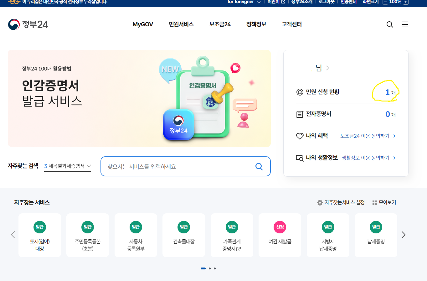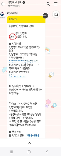 구삐에서 처리 톡이 오면 정부24에 들어가셔서 로그인을 하시면 민원처리현환에 1건이라고 표시가 되어있습니다.