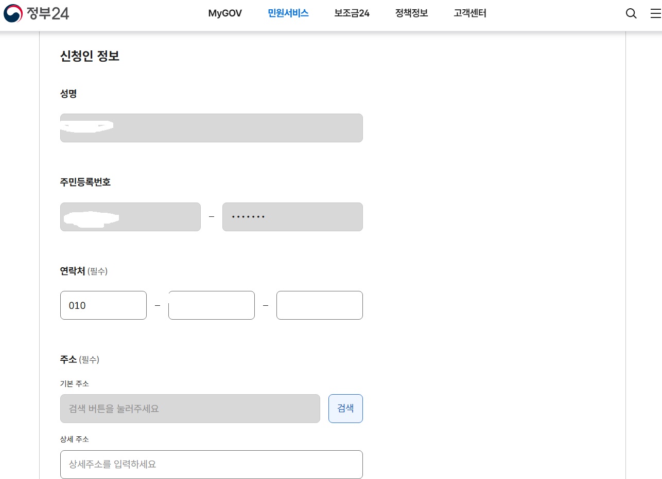 신청인 정보에 성명, 주민등록번호, 연락처, 주소를 적어주세요!!