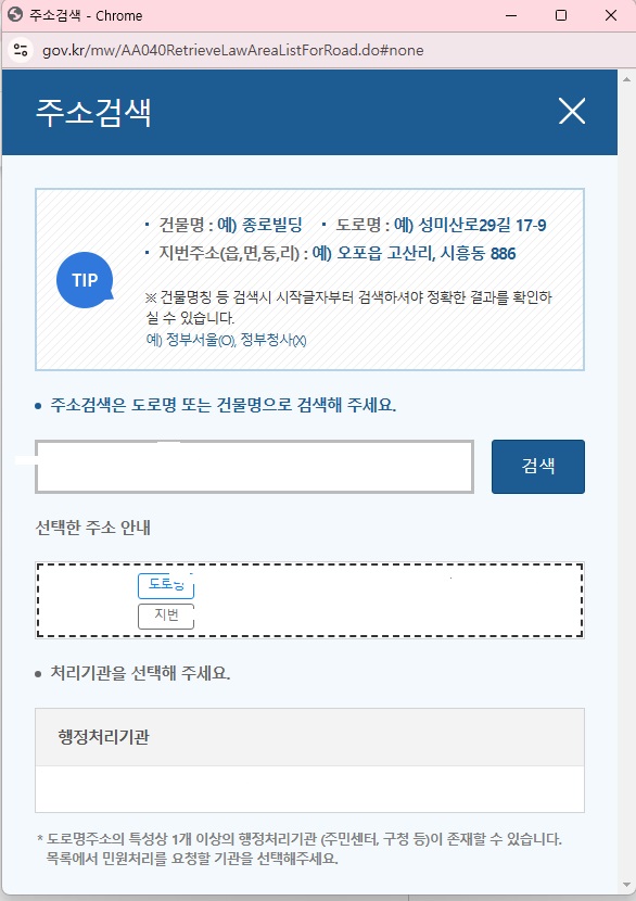 주소를 적어서 클릭하면 행정처리기관이라고 자기가 알아서 뜨더라구요~