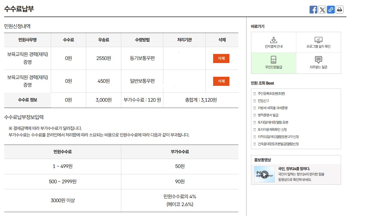 일반이나 등기우편은 약간의 청구요금이 있어서 바로 결제하실 수 있는 창이 나옵니다.