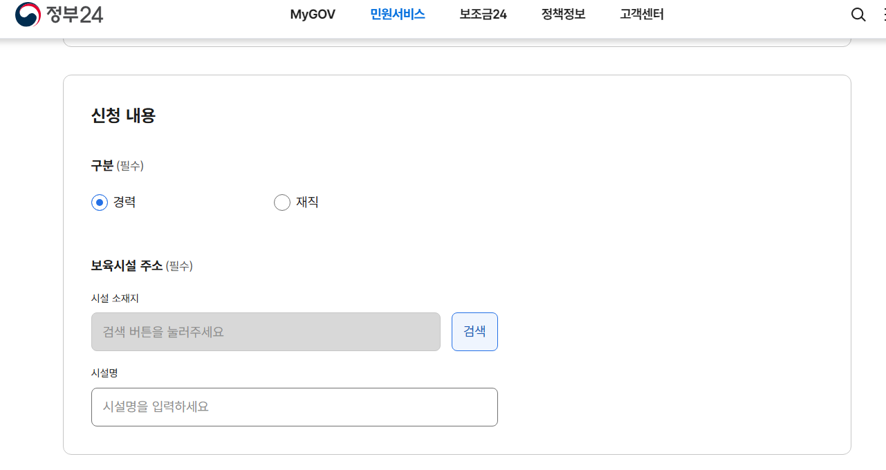 그리고 화면을 밑으로 내리면 드디어 어린이집 경력증명서 신청하는 곳이 나옵니다!!