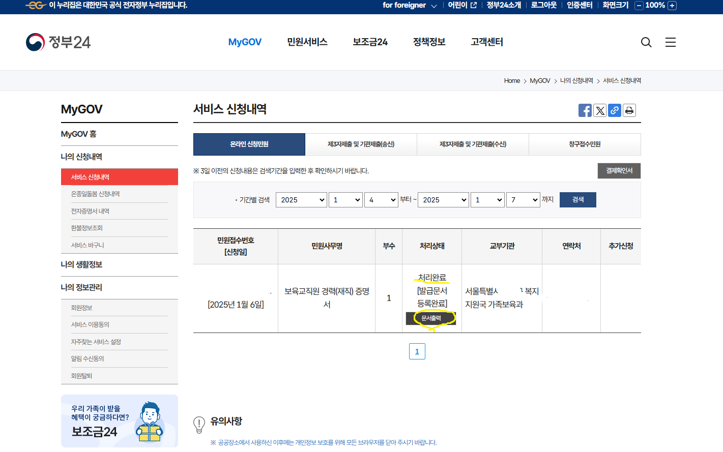 그걸 클릭하셔서 들어가시면 서비스 신청내역이 나옵니다. 문서출력클릭해주세요~