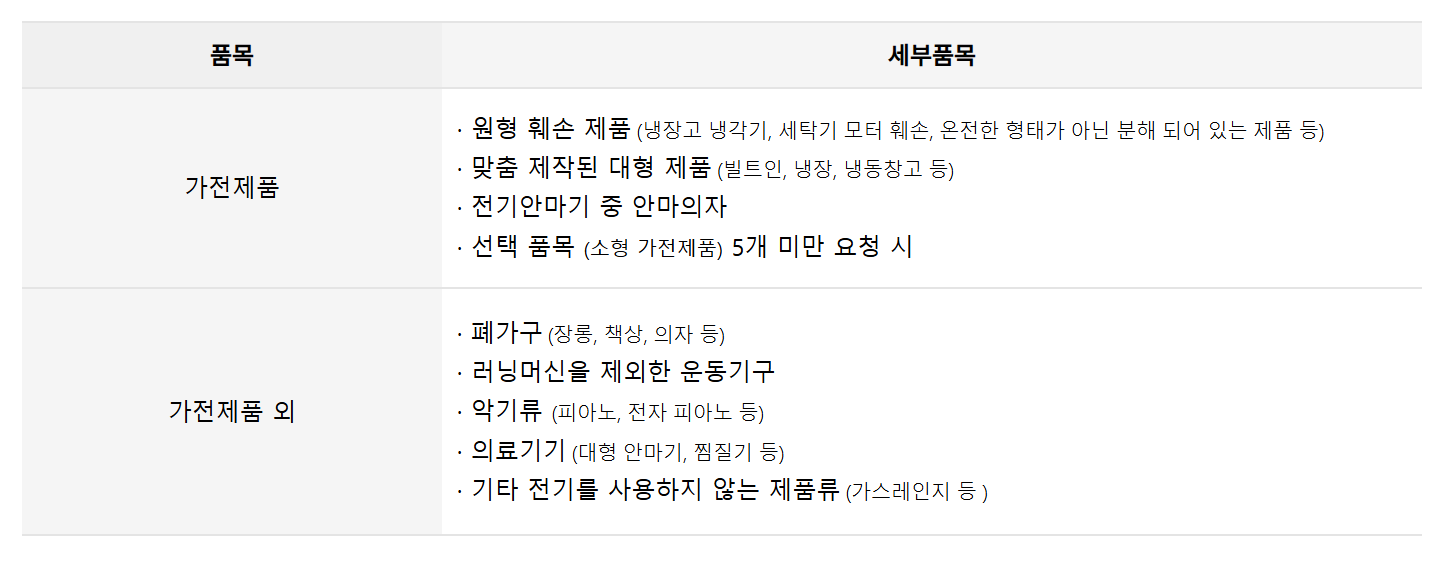 🔹 에어컨, 벽걸이 TV, 빔프로젝터, 유무선공유기, 감시카메라 등 설치(고정)된 제품은 서비스 이용 전 기본 철거가 되어 있어야 수거가 가능합니다. (철거가 되지 않았을 경우, 수거가 불가능 합니다.)
