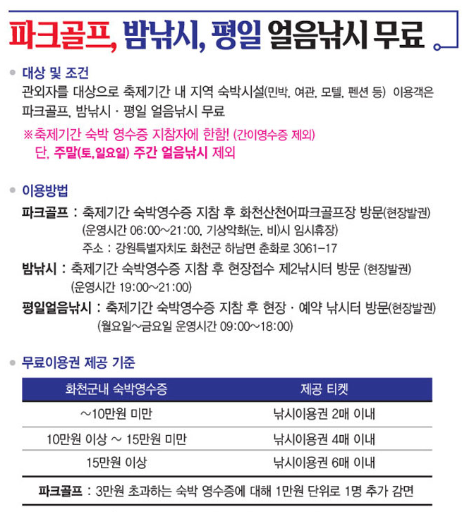 산천어 얼음낚시, 산천어 맨손잡기, 산천어 루어낚시, 파크골프, 밤낚시, 평일 얼음낚시 무료 프로그램들이 있습니다.