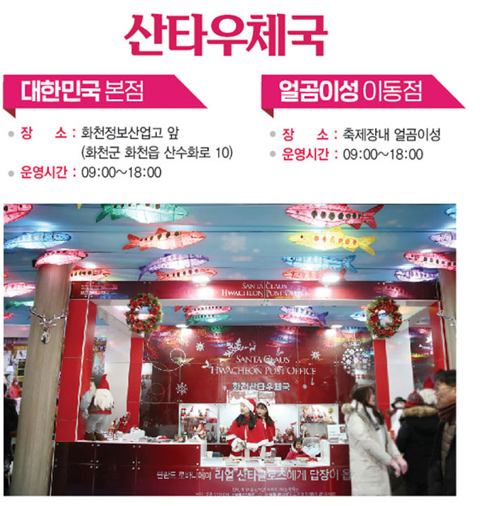 또한, 선등거리, 산타우체국(편지를 쓰면 산타할아버지가 편지를 보내준대요), 얼음조각 광장 까지 다양한 프로그램까지 있어서 지루하지 않게 아침부터 밤늦게까지 즐기다가 오실 수 있습니다!!